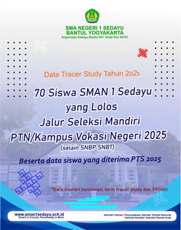 Berikut kami tampilkan data 70 siswa SMAN 1 Sedayu Yogyakarta yang lolos jalur seleksi mandiri/umum PTN/Kampus Vokasi Negeri 2025. Data ini diambil dari kombinasi hasil form Tracer study dan PPDikti.